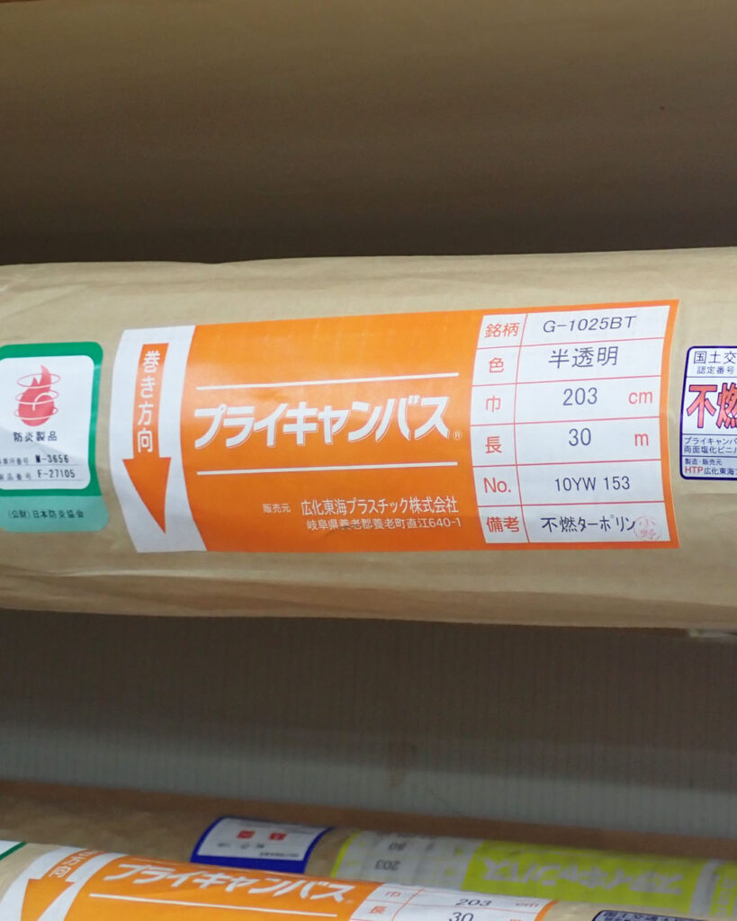 今日は、不燃ターポリンを使ったビニールカーテンを作っています。材料は広化東海プラスチックのG-1025BT半透明です。
