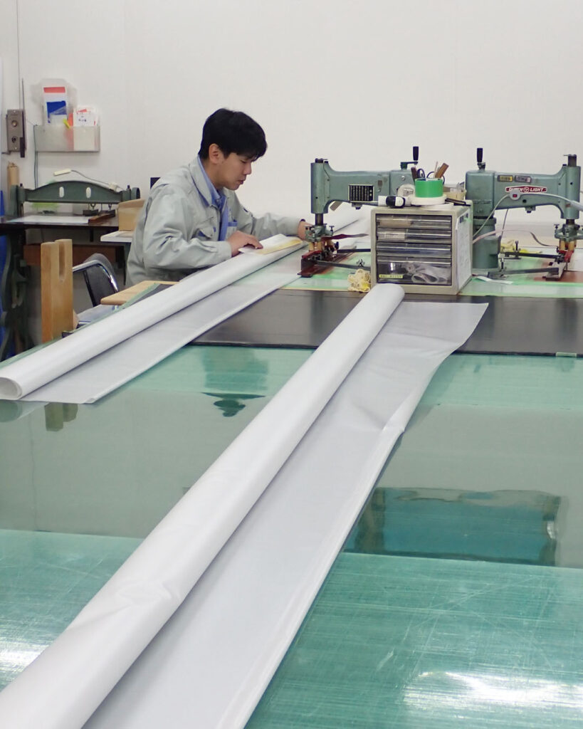 折り曲げるとすぐに「折りキズ」が発生してしまうので、ビニールカーテンの加工も最新の注意を払って行っています。