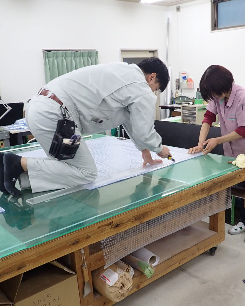 幅継ぎをしたシートも含め、ビニールカバーの寸法に合わせて裁断していきます。裁断機に入らないサイズは、このように手切りでカットしていくことになります。