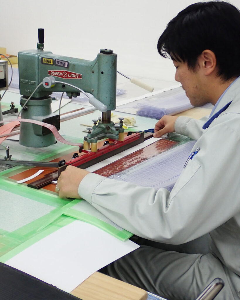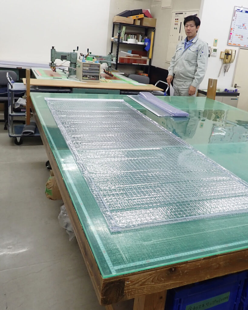 高周波ウエルダーでビニールカーテン上部の折り返し加工をしているところです。