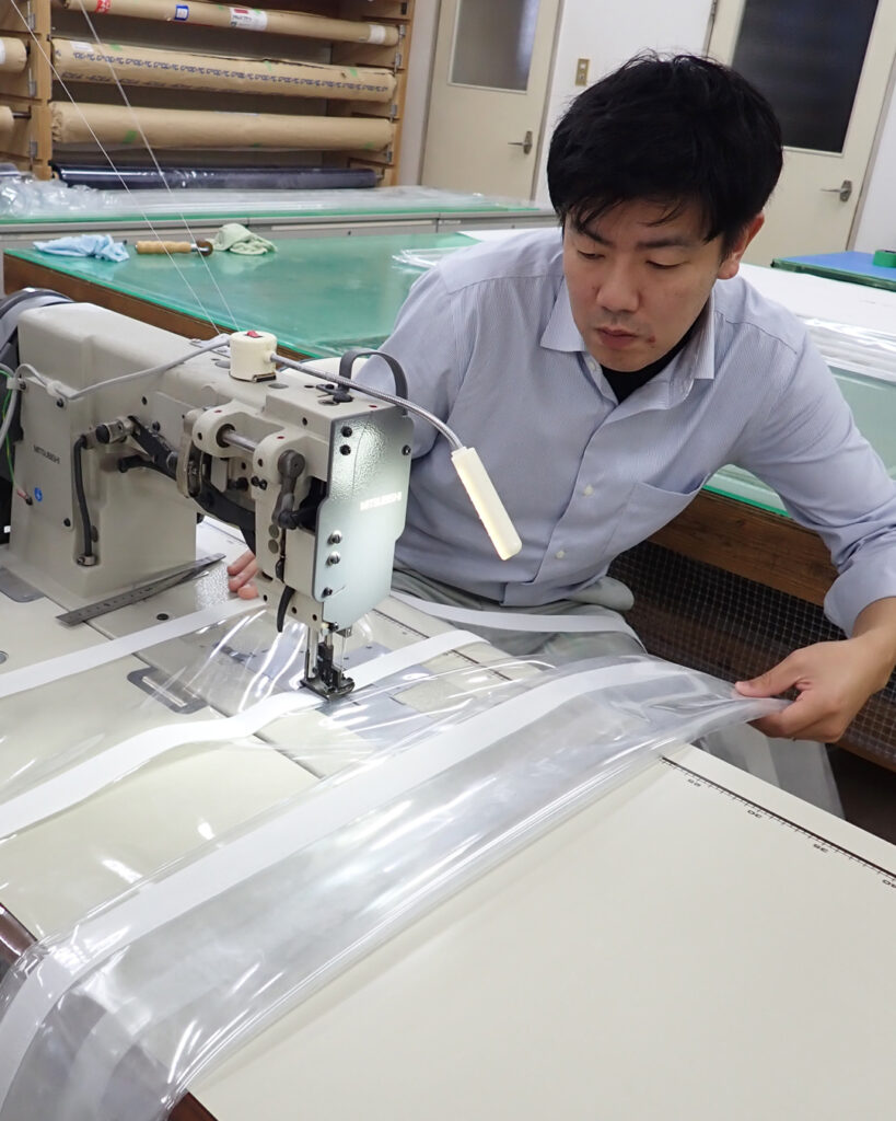 透明ビニールカーテンにマジックテープを縫い付ける作業は、弊社ではよくある作業ではありますが、簡単そうに見えて結構難しさがあります。何故かというとベースの透明ビニールが伸びてしまい、縫製した部分の寸法が予定より大きくなってしまうということが起こりがちです。